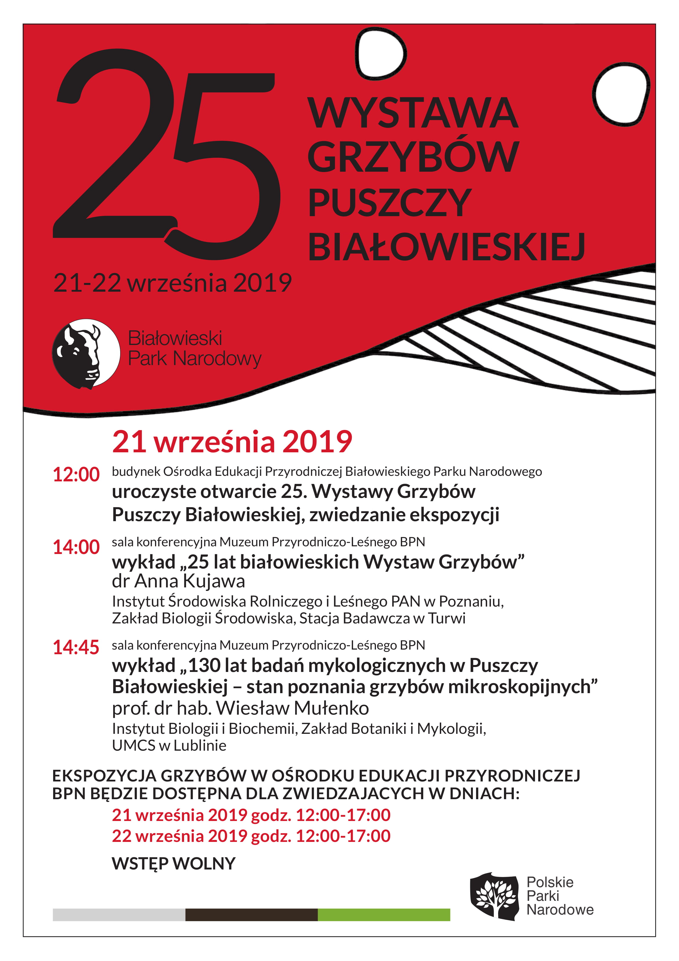 14:00 sala konferencyjna Muzeum Przyrodniczo-Leśnego BPN wykład „25 lat białowieskich Wystaw Grzybów” dr Anna Kujawa Instytut Środowiska Rolniczego i Leśnego PAN w Poznaniu, Zakład Biologii Środowiska, Stacja Badawcza w Turwi