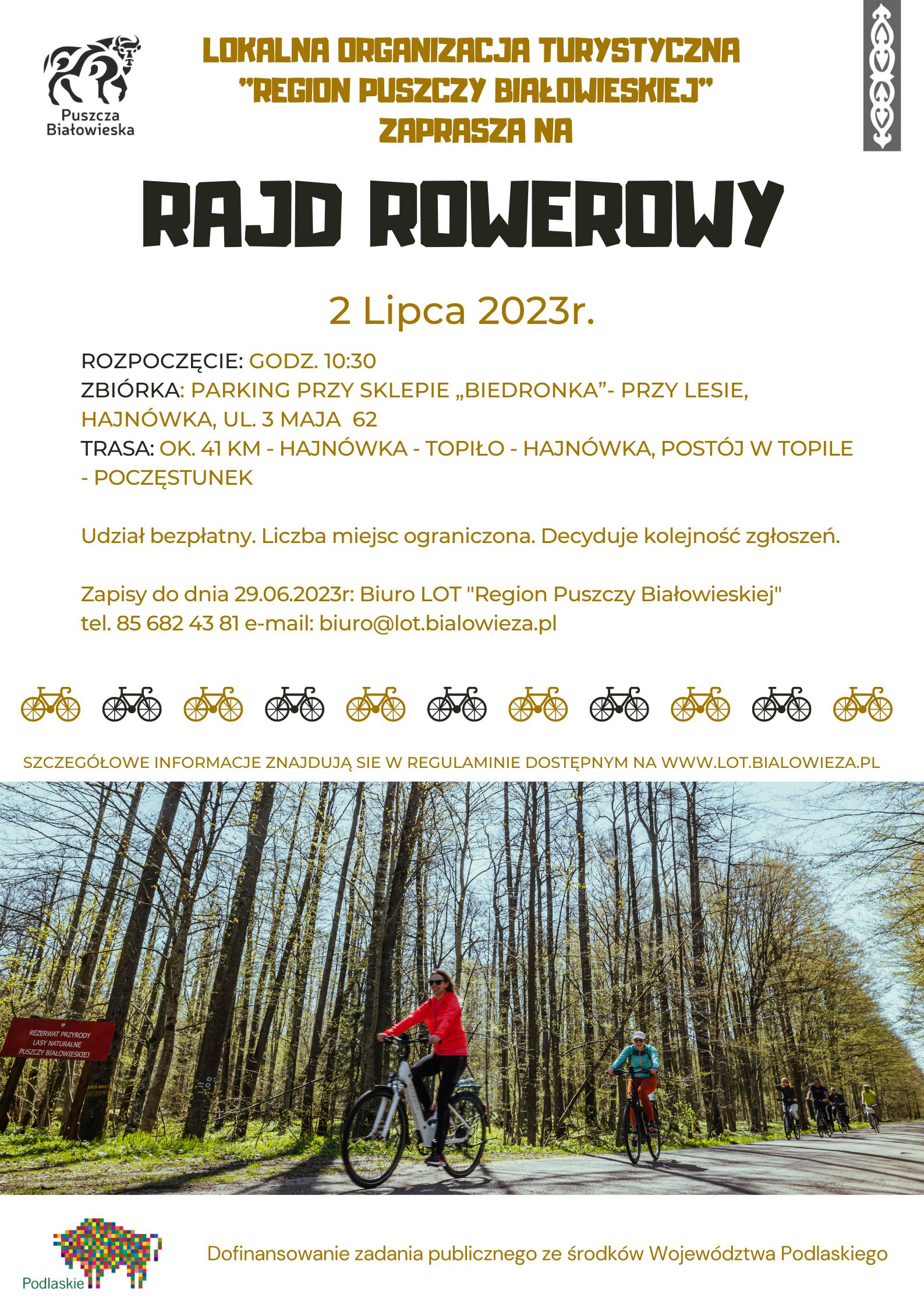 Lokalna Organizacja Turystyczna „Region Puszczy Białowieskiej” zaprasza serdecznie na Rajd Rowerowy organizowany w ramach zadania publicznego „Turystyka aktywna w regionie Puszczy Białowieskiej” dofinansowanego z budżetu Województwa Podlaskiego. Rajd ma charakter integracyjny i rekreacyjny, nie ścigamy się! Trasa rajdu prowadzi szlakami turystycznymi Puszczy Białowieskiej. Szczegóły dotyczące uczestnictwa w rajdzie znajdują się w regulaminie.