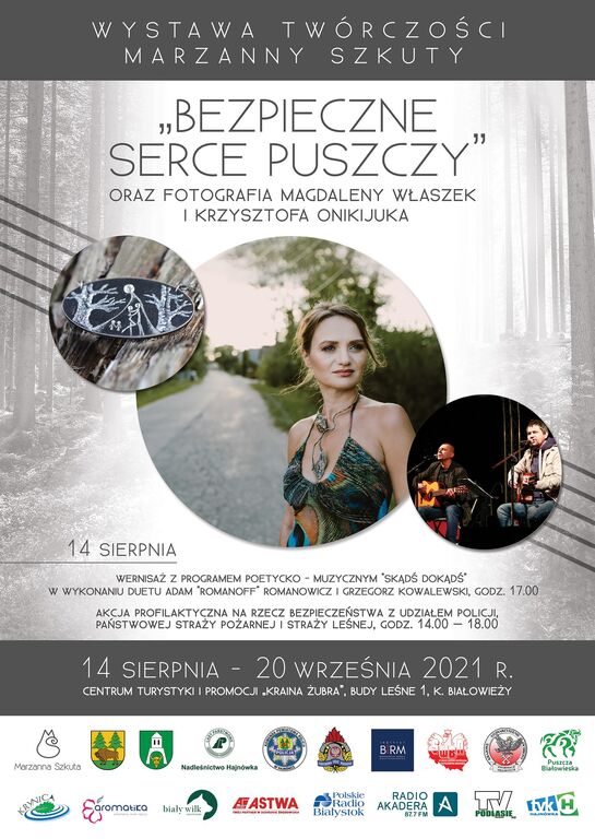 Piątek: 11:00 - 14:00 - zajęcia profilaktyczne, 14:30 - 15:30 - zwiedzanie wystawy z artystką; Sobota: 11:00 - 17:00 - "Puszcza moja Miłość Spotkanie z Marzanną Szkutą oraz Laurą Żurawską. Autorką książki "Puszcza moja Miłość"; Niedziela: 11:00 - 17:00 "Biżuteria, Biżuteryjność, styl" - wystawa prac Marzanna Szkuta - artystka oprowadzi i opowie o wystawie i swojej biżuterii.
