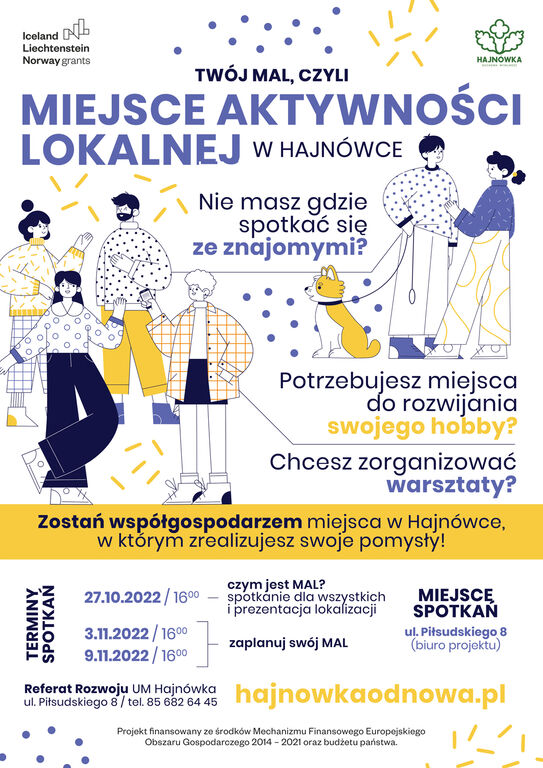 Zapraszamy Państwa serdecznie na spotkanie informacyjne nt. MALi (Miejsc Aktywności Lokalnej), które odbędzie się w dniu 27 października 2022r. o godz. 16.00 w siedzibie Referatu Rozwoju Urzędu Miasta (ul. Piłsudskiego 8).