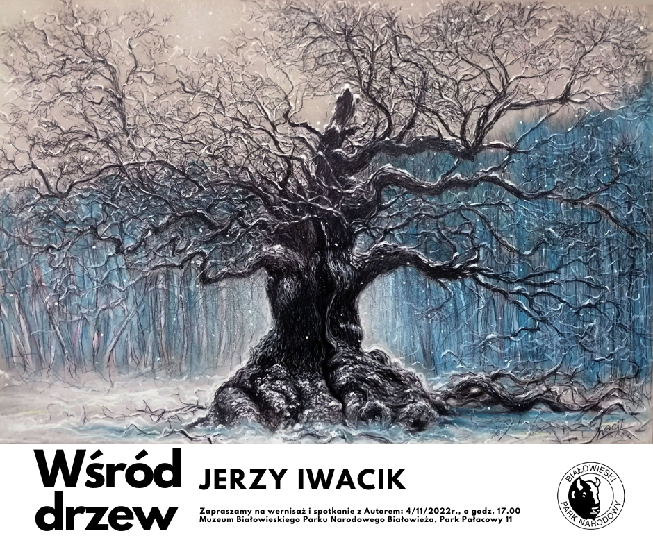 Białowieski Park Narodowy serdecznie zaprasza na nową wystawę czasową do w Muzeum Przyrodniczo-Leśnego Białowieskiego Parku Narodowego w Białowieży (Park Pałacowy 11): „Wśród drzew" oraz na wernisaż i spotkanie z Jerzym Iwacikiem, autorem ponad 80. prac prezentowanych.