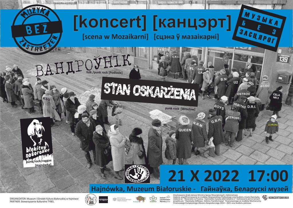 Kolejny koncert z wyjątkowych koncertów klubowych organizowanych przez Muzeum i Ośrodek Kultury Białoruskiej w Hajnówce. Gramy już 18 lat!! To ponad 40 koncertów, na których zagrało ponad 60 zespołów polskich i białoruskich!!! Koncerty pod szyldem „Muzyka bez zastrzeżeń” to koncerty, w których muzyka ma jednoczyć, niszczyć podziały, uprzedzenia, nieść dobry przekaz. Dlatego na scenie występują m.in. zespoły z Polski i Białorusi, grają w języku polskim i białoruskim. A koncerty wspiera ogólnopolska kampania „Muzyka przeciwko rasizmowi”!!!!