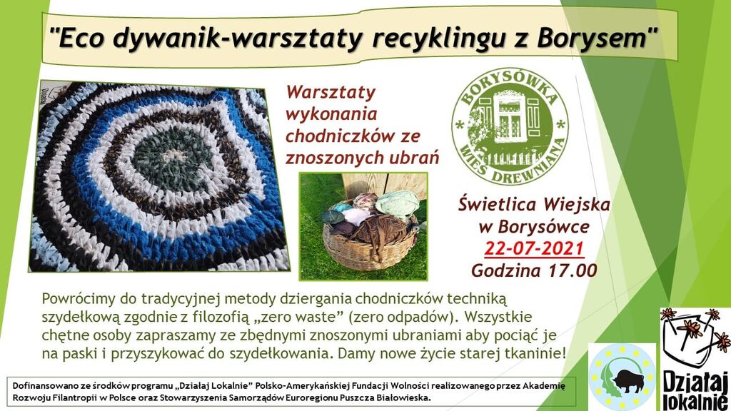 Stowarzyszenie Sympatyków Wsi Borysówka zaprasza do udziału w projekcie "Eco dywaniki- warsztaty recyklingu z Borysem". Spotkanie rozpoczyna się o godz. 17:00 w Świetlicy Wiejskiej w Borysówce.