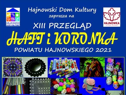 Hajnowski Dom Kultury zaprasza na XIII Przegląd Haftu i Koronki Powiatu Hajnowskiego 2021. Wystawa 19.06 – 02.07.2021 – Galeria HDK. Wernisaż 20 czerwca 2021 r. godz. 14:00 (niedziela).