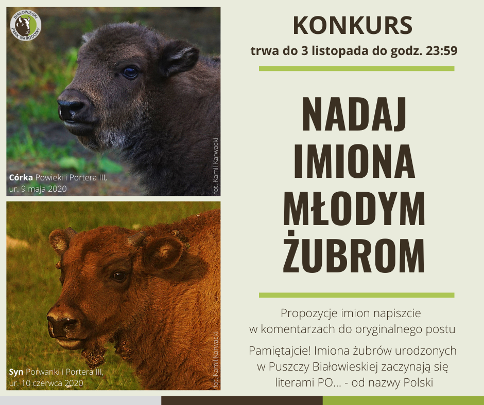 Jeśli kochacie dziką przyrodę i żubry, mamy dla Was Konkurs! Uruchomcie fantazję i napiszcie w komentarzu, jak według Was mogą nazywać się młode żubry urodzone w dniach: 9 maja i 10 czerwca 2020 roku w Rezerwacie Pokazowym Żubrów Białowieskiego Parku Narodowego. Żubry, które już powitaliśmy na świecie, to para – samica i samiec, więc czekamy na propozycje imion zarówno męskich jak i żeńskich.