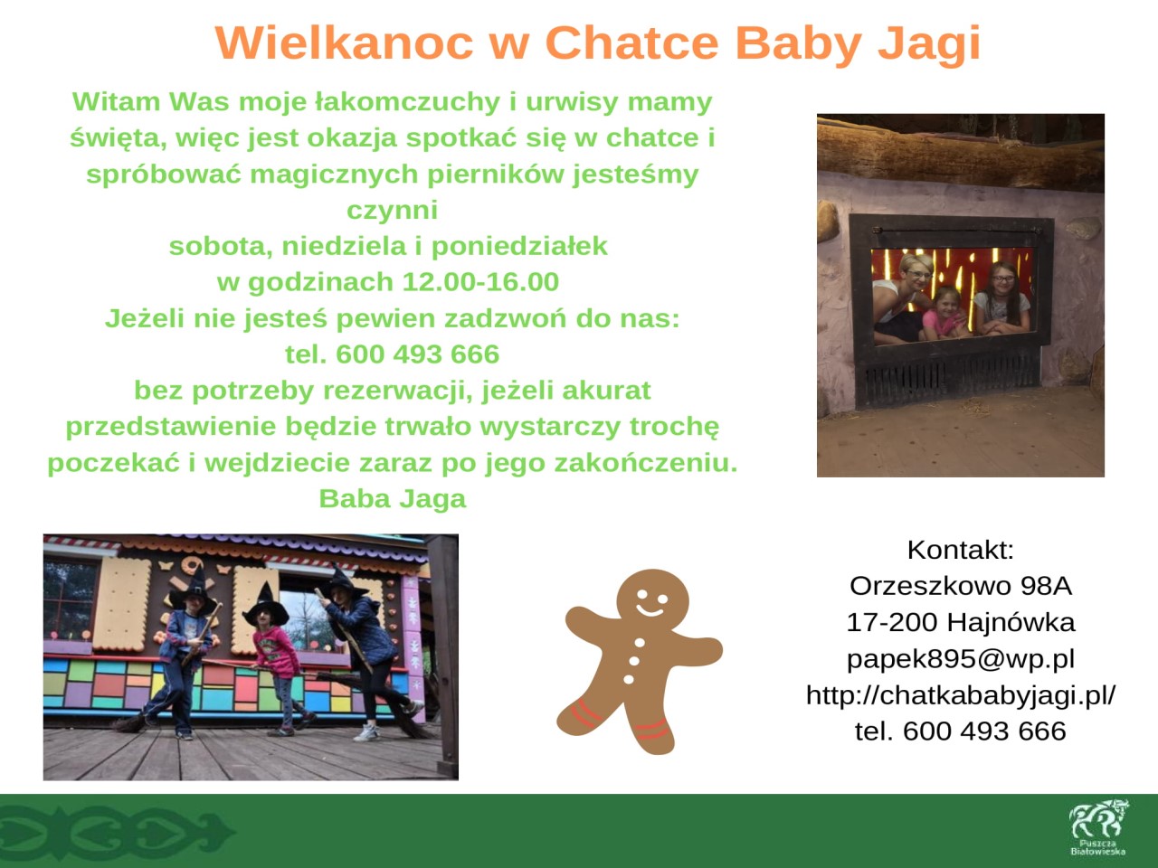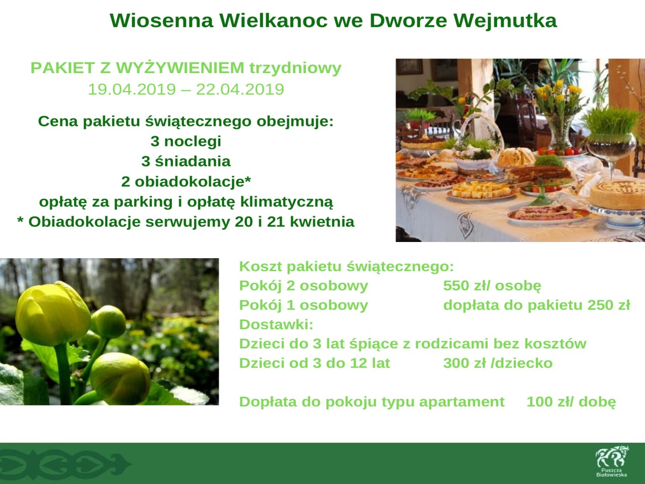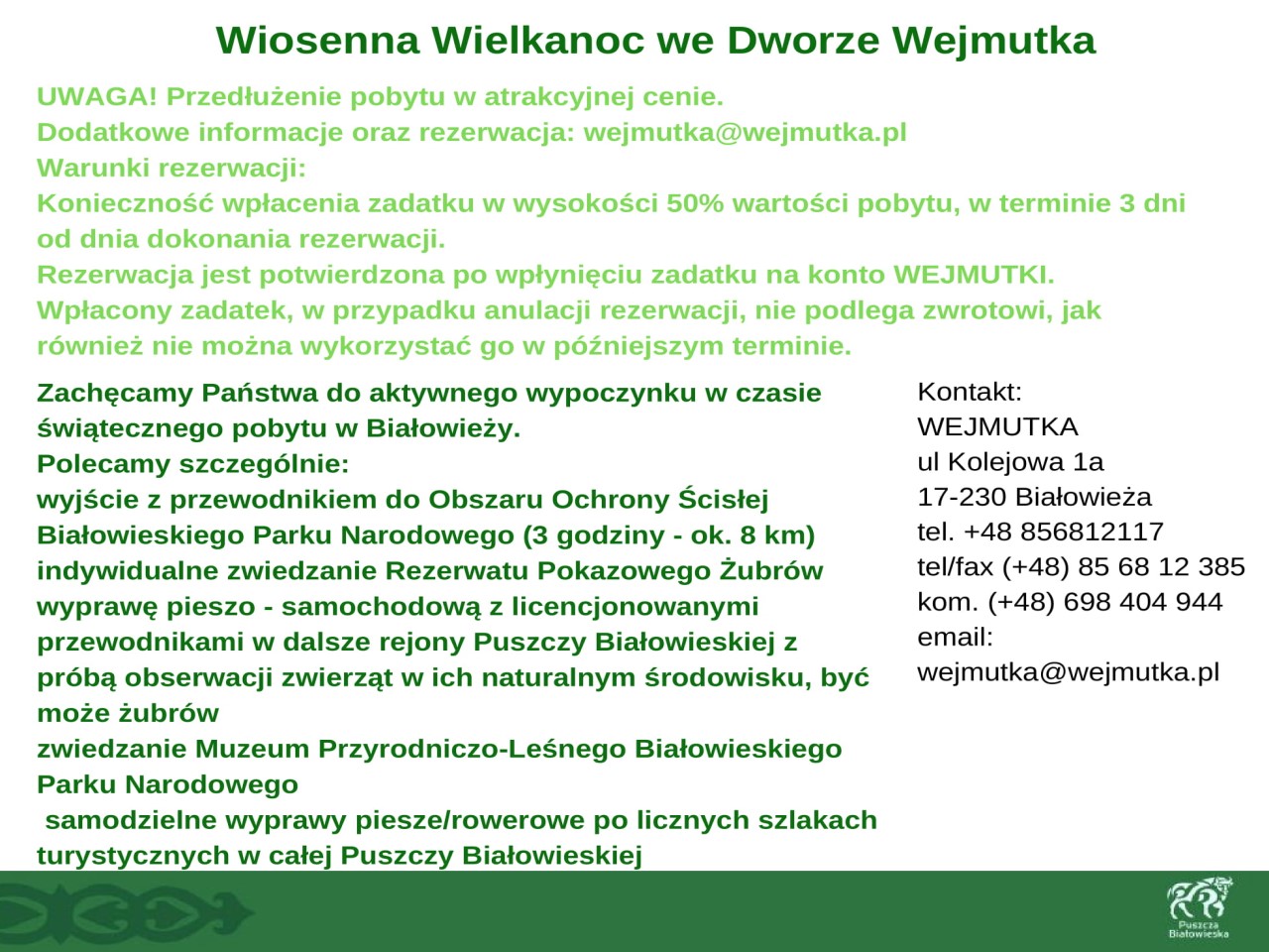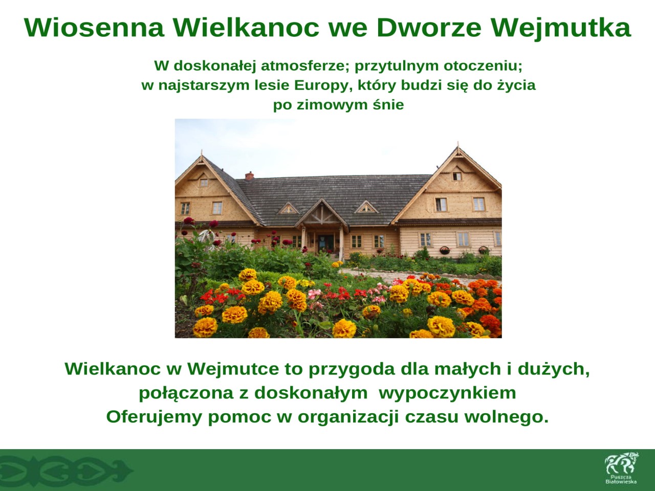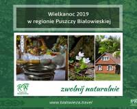 Wszystkie osoby które będą wypoczywać w okresie Wielkanocnym w regionie Puszczy Białowieskiej zapraszamy do skorzystania z usług członków Lokalnej Organizacji Turystycznej "Region Puszczy Białowieskiej". Proponujemy wędrówki przyrodnicze po Puszczy organizowane przez PTTK Oddział im. J.J. Karpińskiego w Białowieży, niezapomnianą i pełną wrażeń wizytę w Chatce Baby Jagi, przygodę dla małych i dużych we Dworze Wejmutka, przejażdżki Białowieskimi Drezynami oraz wiele innych atrakcji.