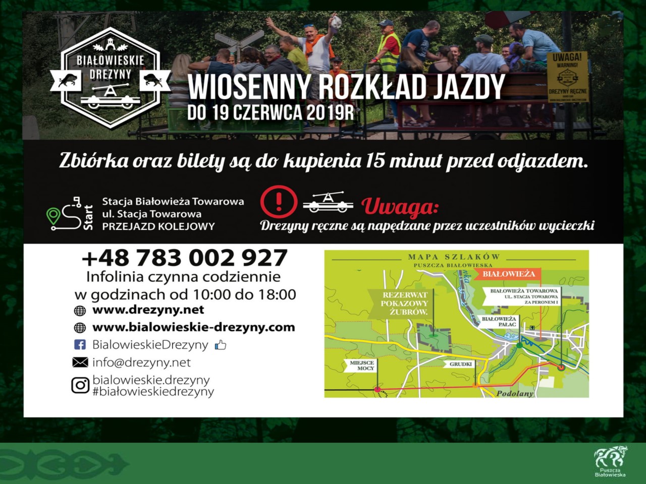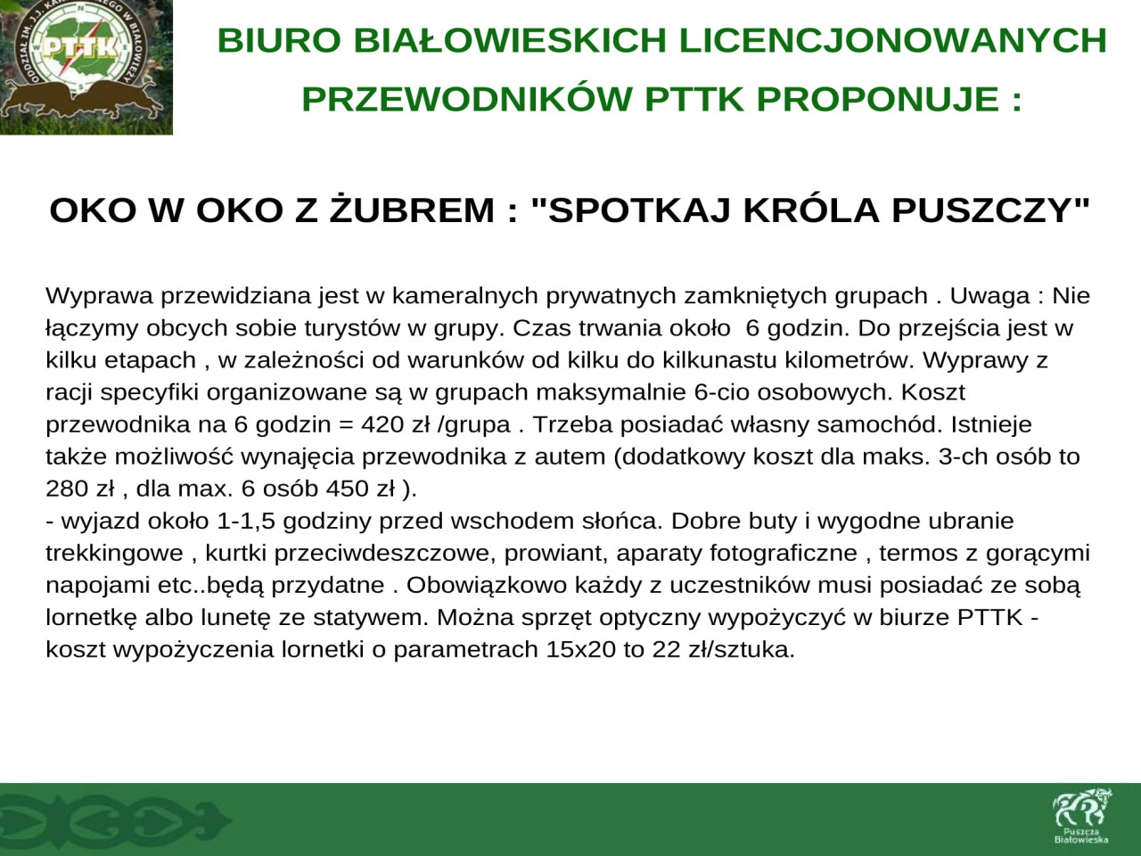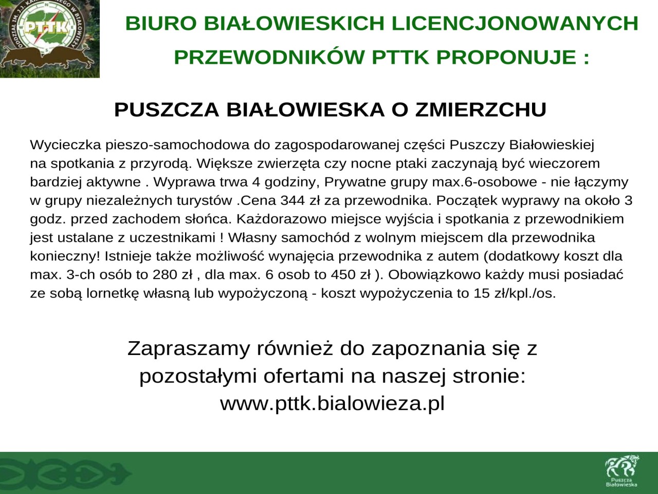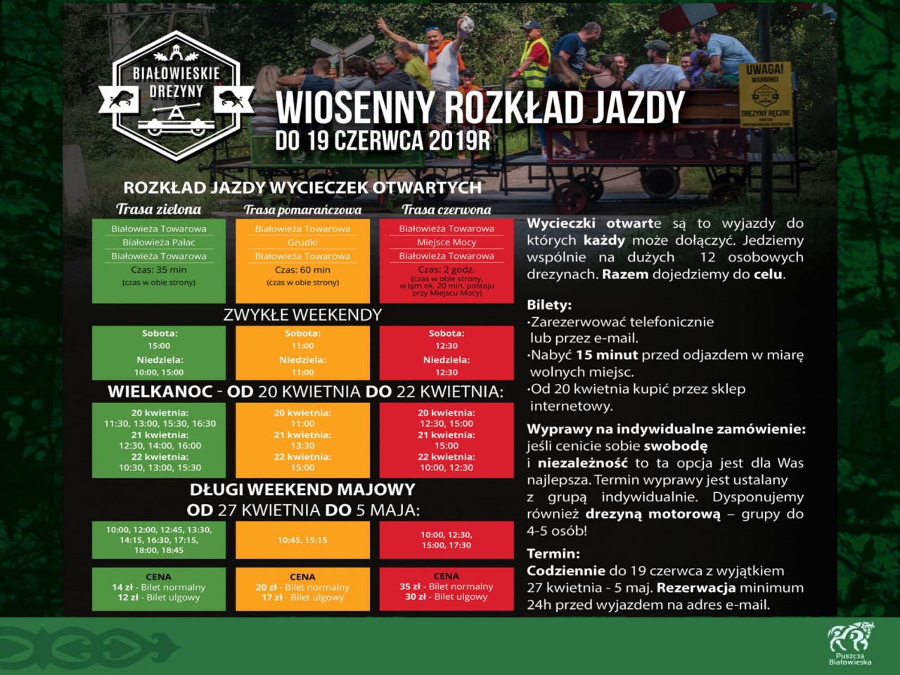 Wszystkie osoby które będą wypoczywać w okresie Wielkanocnym w regionie Puszczy Białowieskiej zapraszamy do skorzystania z usług członków Lokalnej Organizacji Turystycznej "Region Puszczy Białowieskiej". Proponujemy wędrówki przyrodnicze po Puszczy organizowane przez PTTK Oddział im. J.J. Karpińskiego w Białowieży, niezapomnianą i pełną wrażeń wizytę w Chatce Baby Jagi, przygodę dla małych i dużych we Dworze Wejmutka, przejażdżki Białowieskimi Drezynami oraz wiele innych atrakcji.