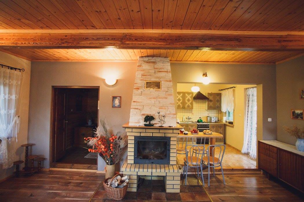 - na dole znajduje się salon z kominkiem oraz aneks kuchenny z pełnym wyposażeniem,