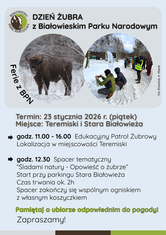 - godz.11:00 do 16:00 - Edukacyjny Patrol Żubrowy w Teremiskach