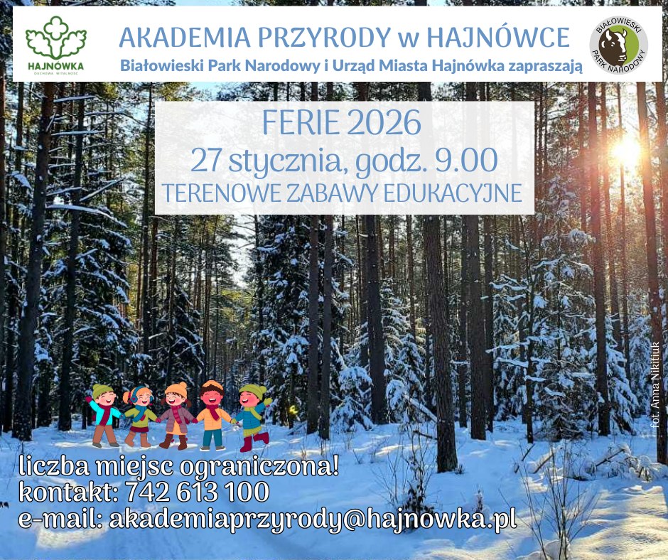 Akademia Przyrody w Hajnówce, we współpracy z Białowieskim Parkiem Narodowym, zaprasza dzieci na terenowe zajęcia edukacyjne organizowane podczas ferii zimowych 2026.