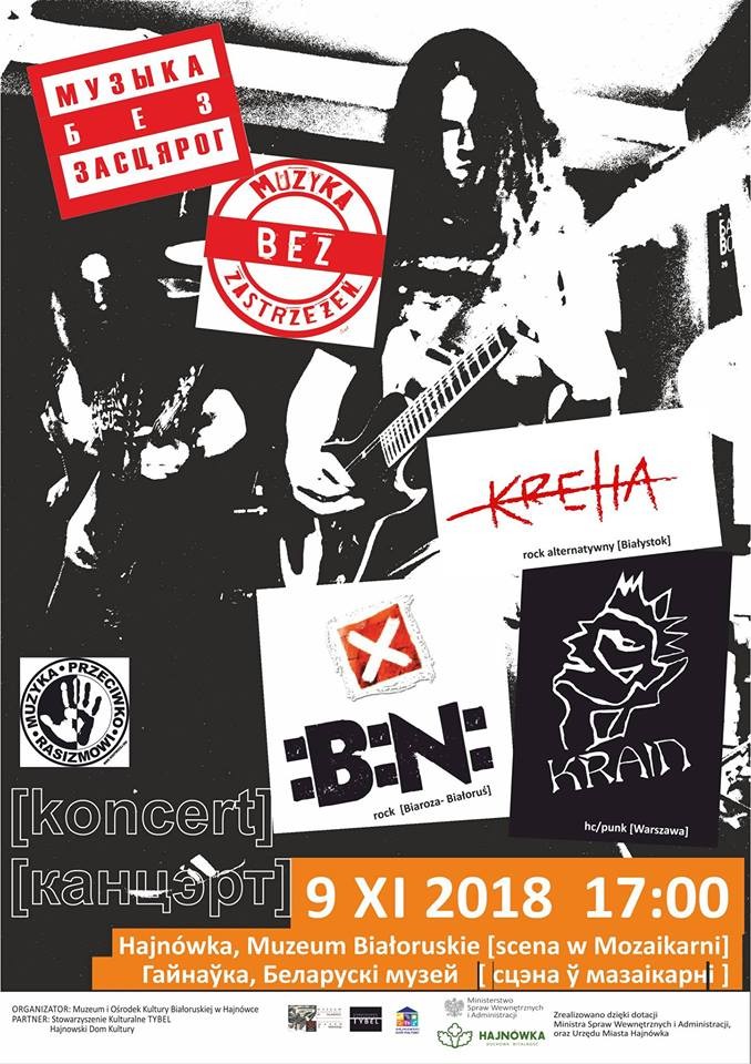 Kolejna edycja wyjątkowych koncertów klubowych organizowanych przez Muzeum i Ośrodek Kultury Białoruskiej w Hajnówce. Koncerty pod szyldem „Muzyka bez zastrzeżeń” to koncerty, w których muzyka ma jednoczyć, niszczyć podziały, uprzedzenia, nieść dobry przekaz. Dlatego na scenie występują m.in. zespoły z Polski i Białorusi, grają w języku polskim i białoruskim. Kiedy: 9.11.2018 godz. 17.00, wstęp wolny