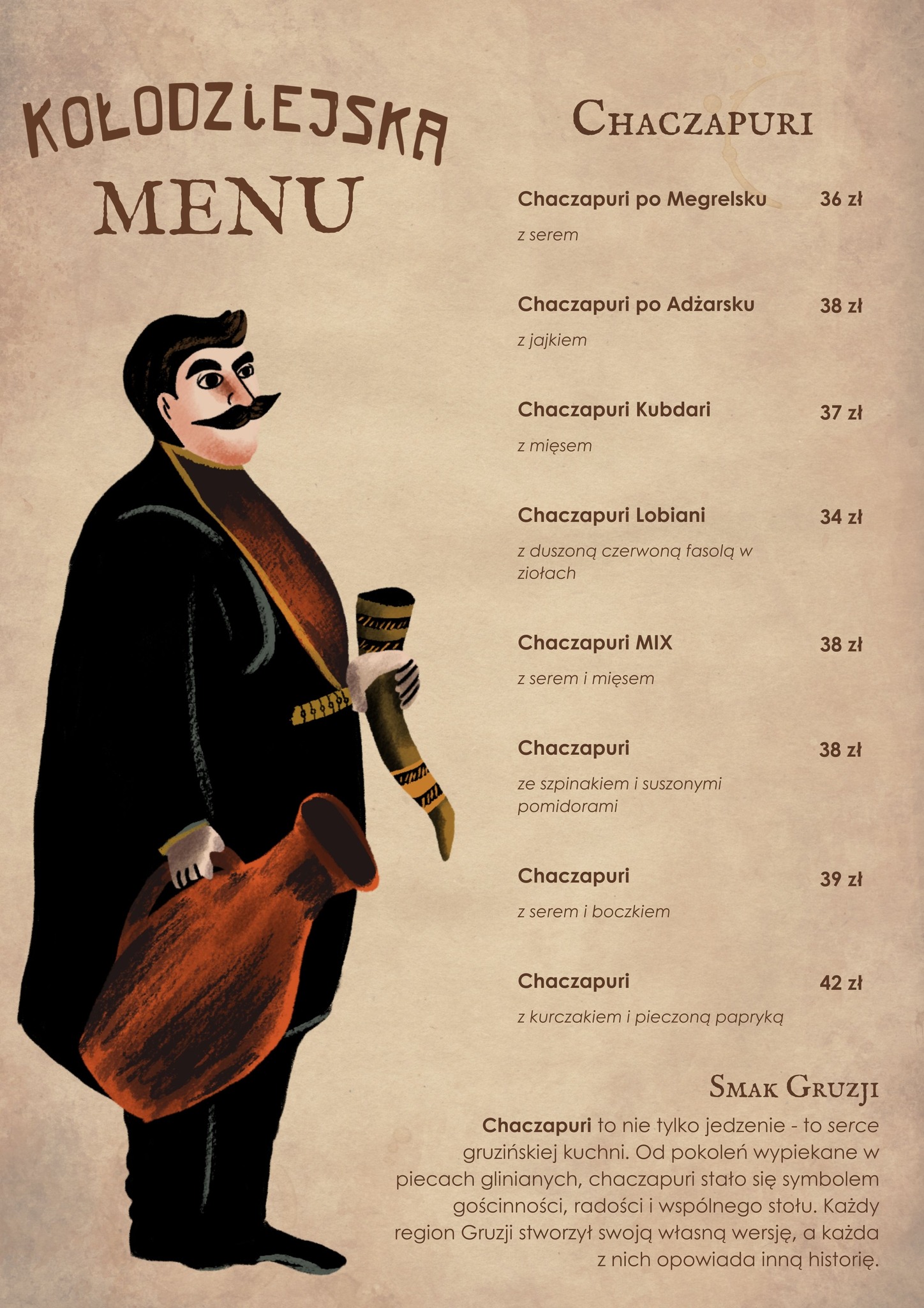 Dopełnieniem są aromatyczne wina gruzińskie, starannie dobrane tak, by podkreślić każde danie i zachęcić do dzielenia się przy stole.