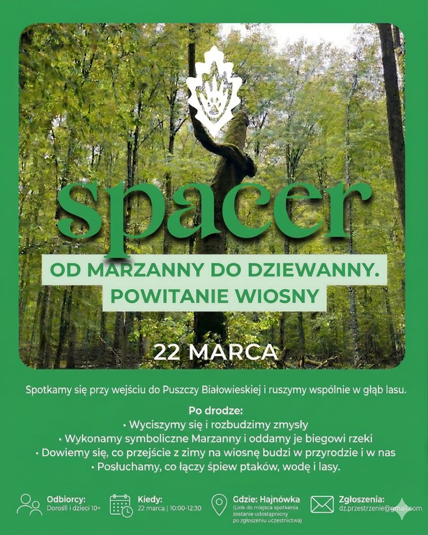Zapraszamy na spacer na powitanie wiosny! Spotkamy się w Hajnówce przy wejściu do Puszczy i udamy się wspólnie w głąb Lasu. Po drodze wyciszymy się, rozbudzimy zmysły, a jak już dotrzemy do rzeki, to wykonamy symboliczne- ekologiczne Marzanny i pozostawimy je biegowi rzeki…dotkniemy też symboliki czasu przejścia i poszukamy odniesienia do tego, co się dzieje w naszej psychice. Posłuchamy też od specjalisty, na czym polega susza hydrologiczna i dlaczego rzeki w Puszczy wysychają…