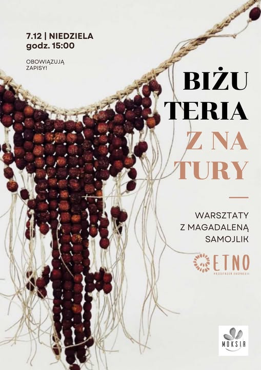 Zapraszamy serdecznie na warsztaty tworzenia biżuterii naturalnej. Razem z Madaleną Samojlik z ETNO - przestrzeń ekspresji będziemy tworzyć biżuterię z patyków, kory, łodyg, nasion, łupin, ziaren, muszli oraz ręcznie skręcanego lnu.