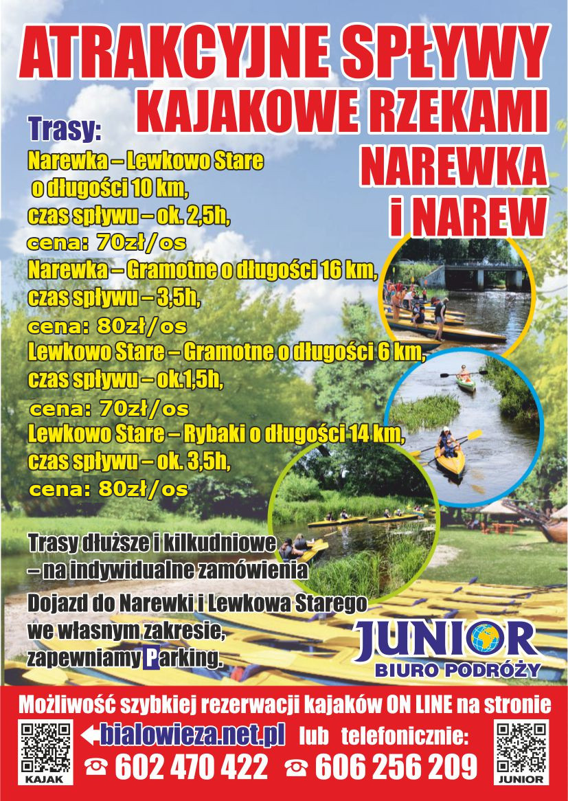 Podkreślamy, iż zamówień na kajaki można dokonać WYŁĄCZNIE online poprzez system rezerwacji kajaków lub telefonicznie na numery telefonów BP Junior tj. 85 741 57 20, 791 792 044, 602 470 422 oraz 606 256 209. W przypadku nie spełnienie powyższego obowiązku nie gwarantujemy dostępności kajaków i realizacji spływu.