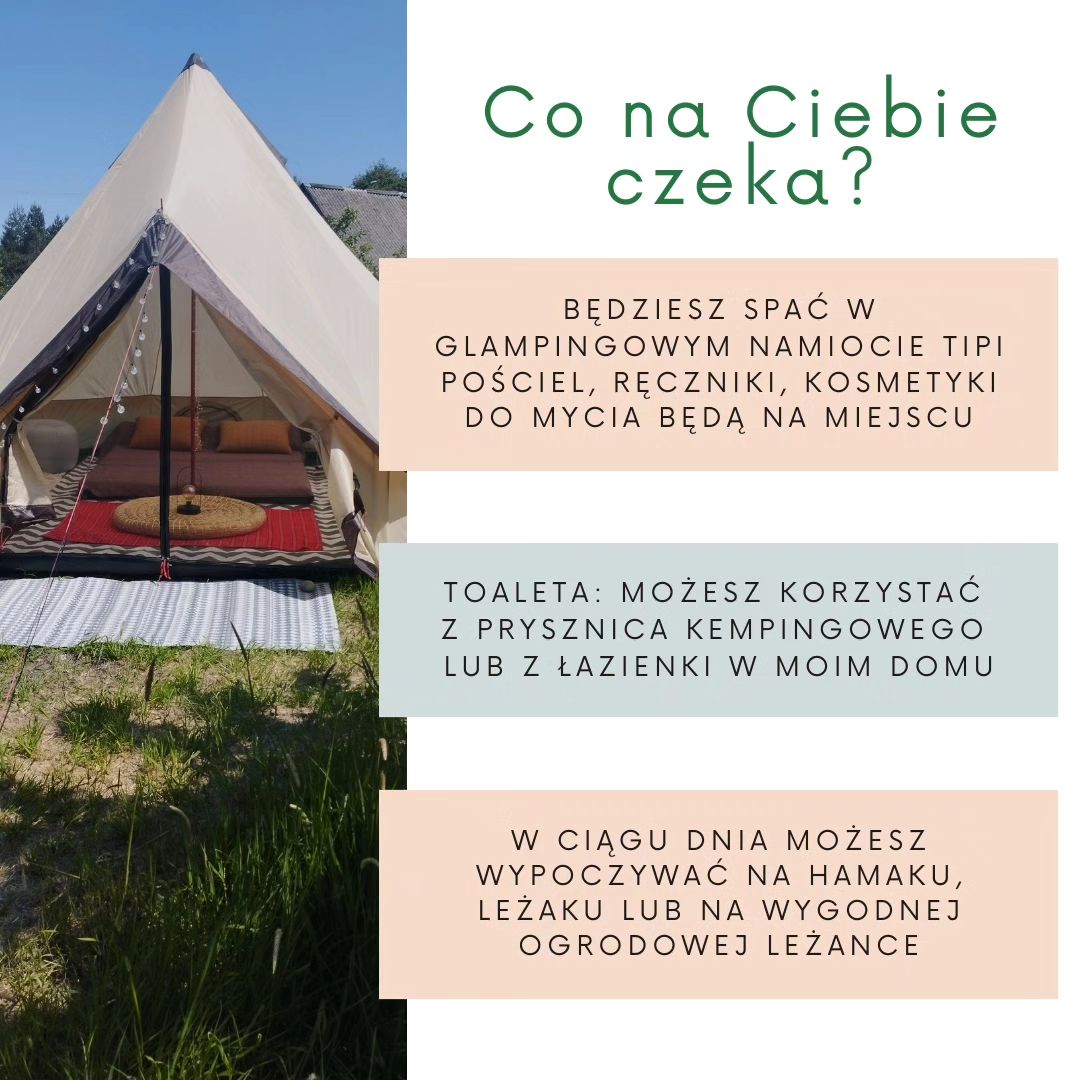 - Będziesz spać w Glampingowym namiocie tipi, pościel, ręczniki, kosmetyki do mycia będą na miejscu