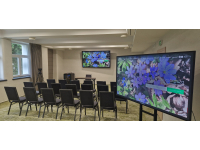 Sala wyposażona jest w najnowcześnieszy sprzęt min. 98 calowy telewizor oraz ekrany wspomagające, kamerę i osprzęt do transmisji konferencji na żywo, sprzęt do organizacji wideokonferencji i konferencji hybrydowych. Wyposażenie umowżliwia również podłączenie się i obsługę konferencji tłumaczom symultanicznym.