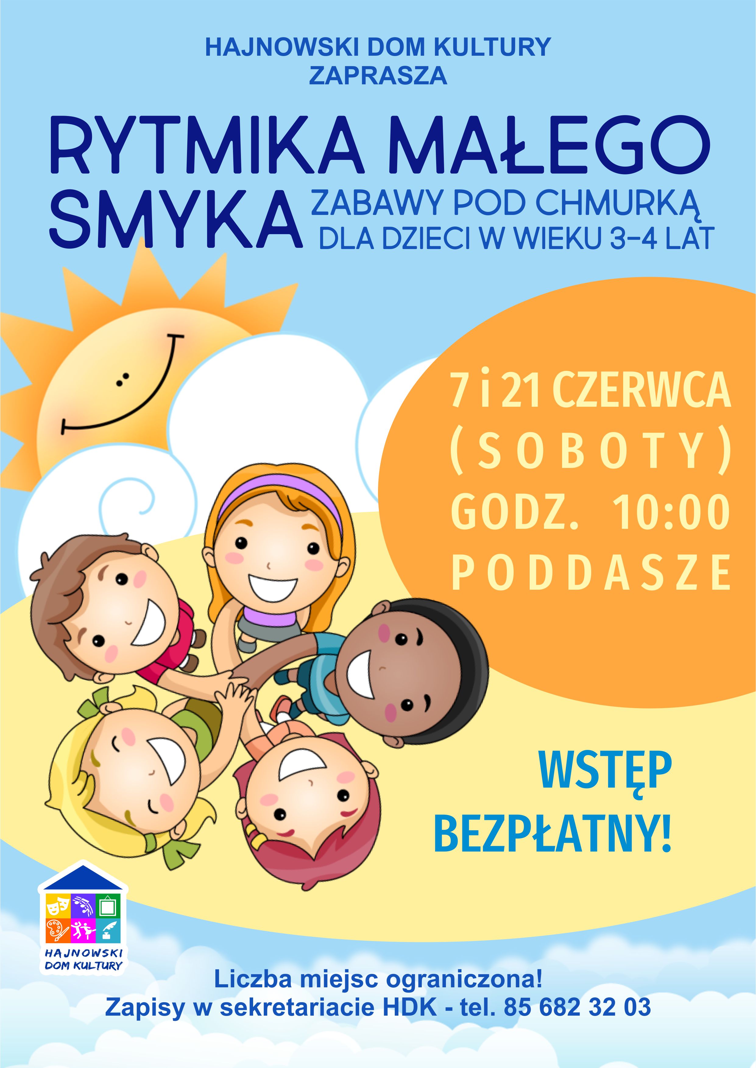 Hajnowski Dom Kultury zaprasza na kolejne zajęcia „Rytmika Małego Smyka”, zabawy pod chmurką dla dzieci w wieku 3-4 lat.