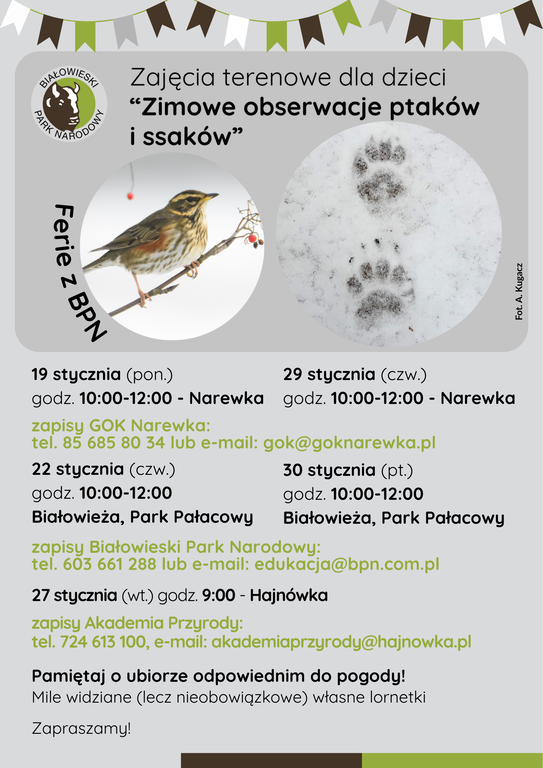 - 30.01 (piątek) 10:00 - Białowieża, Park Pałacowy – zapisy przez BPN (tel. 603 661 288)