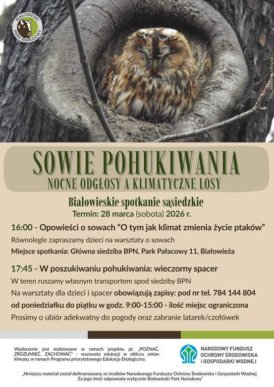 Podczas trasy terenowej będziemy nasłuchiwać i obserwować sowy bez wabienia ich. Prosimy o ciche zachowanie, trzymanie odstępu od miejsc potencjalnych lęgów i stosowanie się do poleceń przewodników. Dla rodzin z dziećmi będzie utworzona specjalna grupa terenowa. Udział odbywa się na własną odpowiedzialność, prosimy o stosowny ubiór terenowy i obuwie, latarkę/czołówkę oraz ciepłe ubranie.