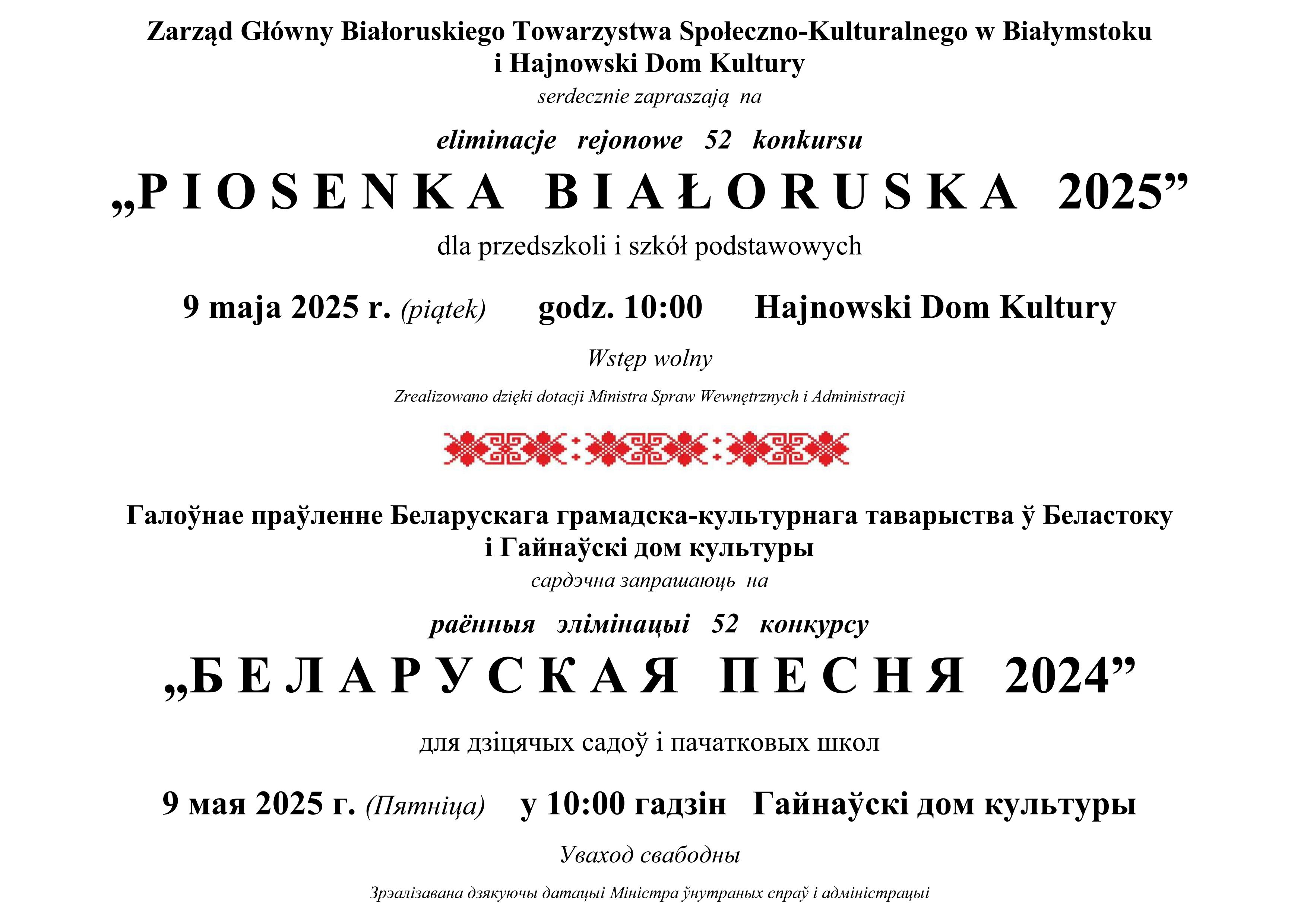 Zarząd Główny Białoruskiego Towarzystwa Społeczno-Kulturalnego w Białymstoku i Hajnowski Dom Kultury serdecznie zapraszają na eliminacje rejonowe 52 konkursu „P I O S E N K A B I A Ł O R U S K A 2025” dla przedszkoli i szkół podstawowych