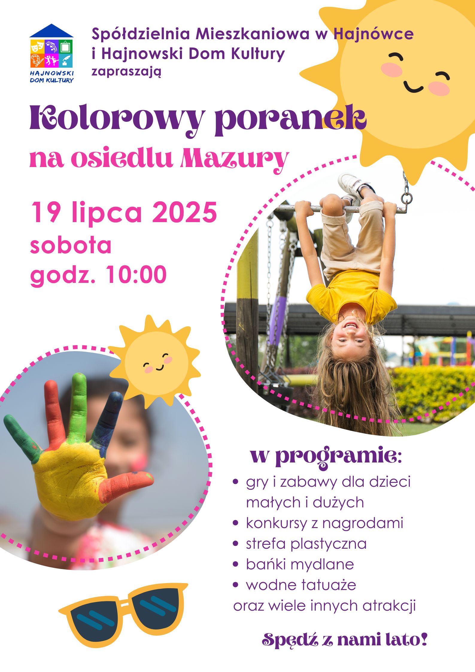 Spółdzielnia Mieszkaniowa w Hajnówce oraz Hajnowski Dom Kultury zapraszają wszystkie dzieci (i nie tylko!) na radosne wydarzenie wakacyjne – Kolorowy Poranek!