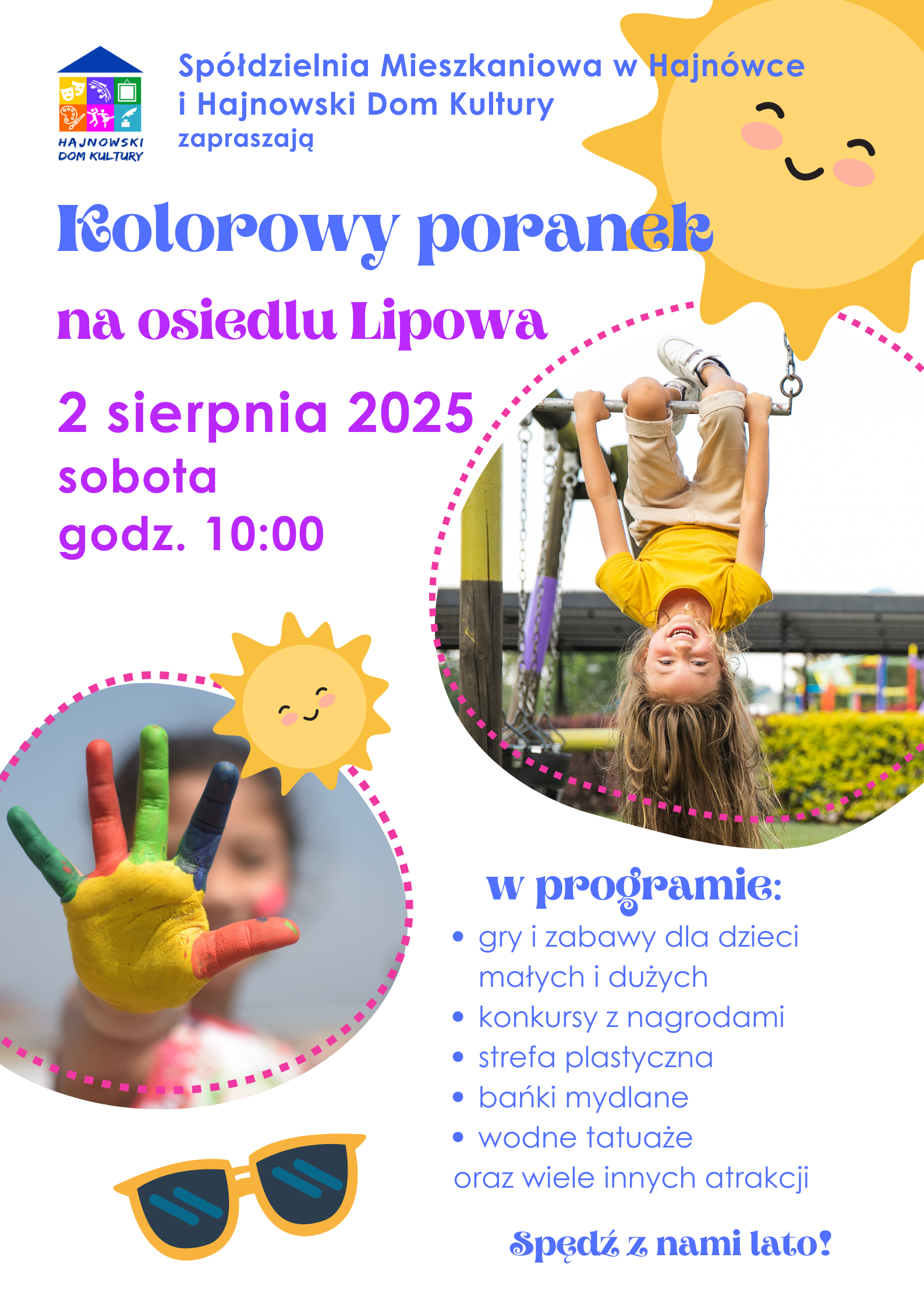 Spółdzielnia Mieszkaniowa w Hajnówce oraz Hajnowski Dom Kultury zapraszają wszystkie dzieci (i nie tylko!) na radosne wydarzenie wakacyjne – Kolorowy Poranek!