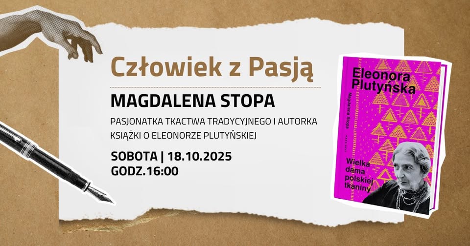 Gościem będzie Magdalena Stopa – historyczka sztuki, dziennikarka i autorka książki "Eleonora Plutyńska. Wielka dama polskiej tkaniny". Podczas spotkania poznamy niezwykłą artystki, która przybyła na Podlasie, by tchnąć nowe życie w ginące tkactwo ludowe.